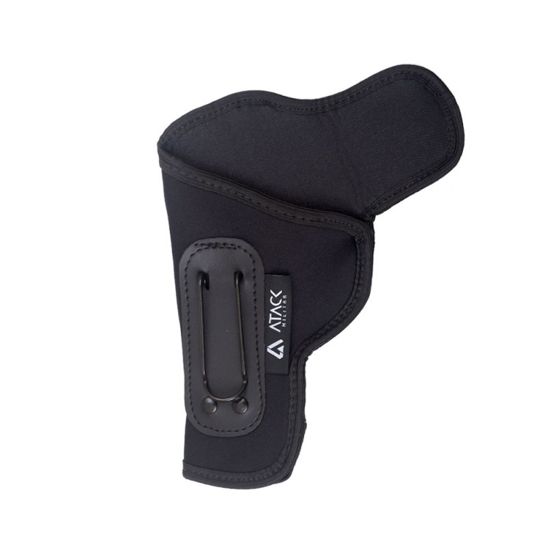 Fabricado em Neoprene de alta resistência e elasticidade, o coldre se adapta ao corpo e ao formato da arma, proporcionando ajuste seguro e confortável mesmo em uso prolongado. A fixação é feita por meio de gancho, garantindo estabilidade no porte interno e facilitando o posicionamento discreto.
